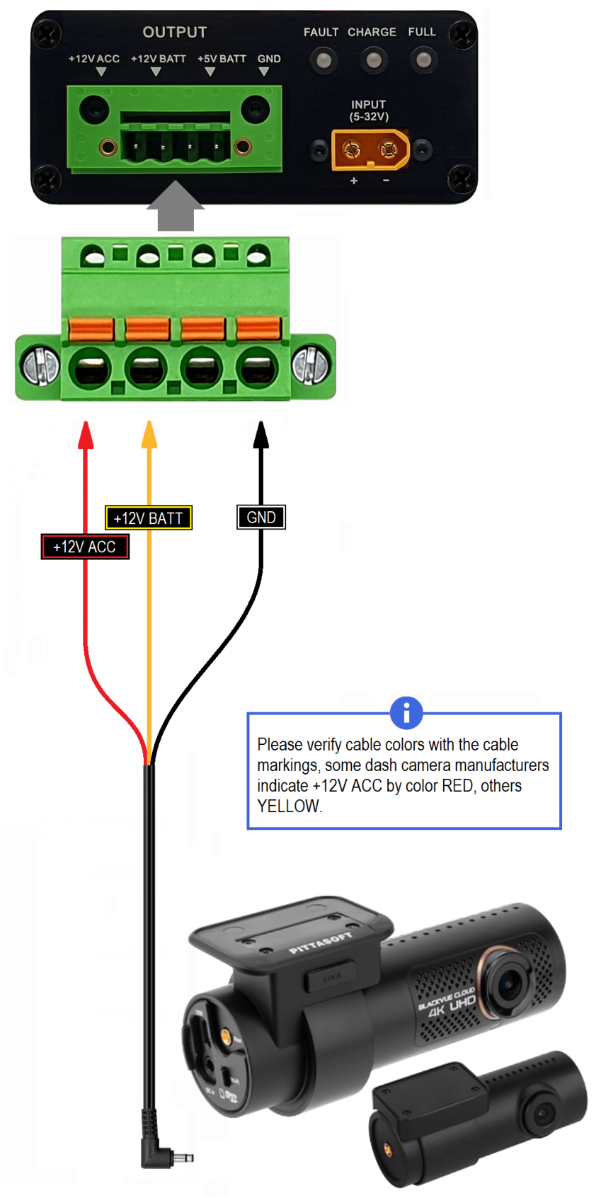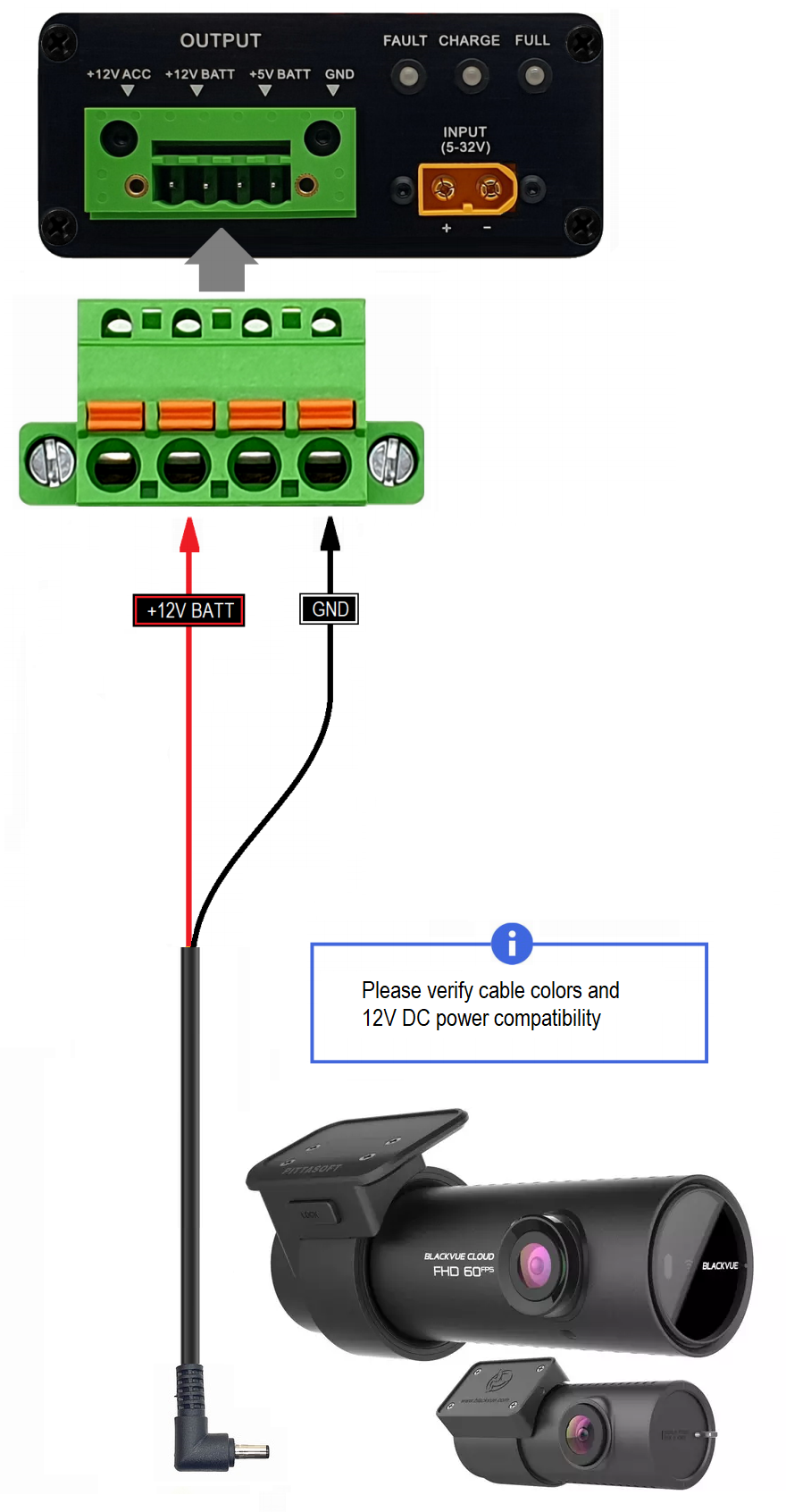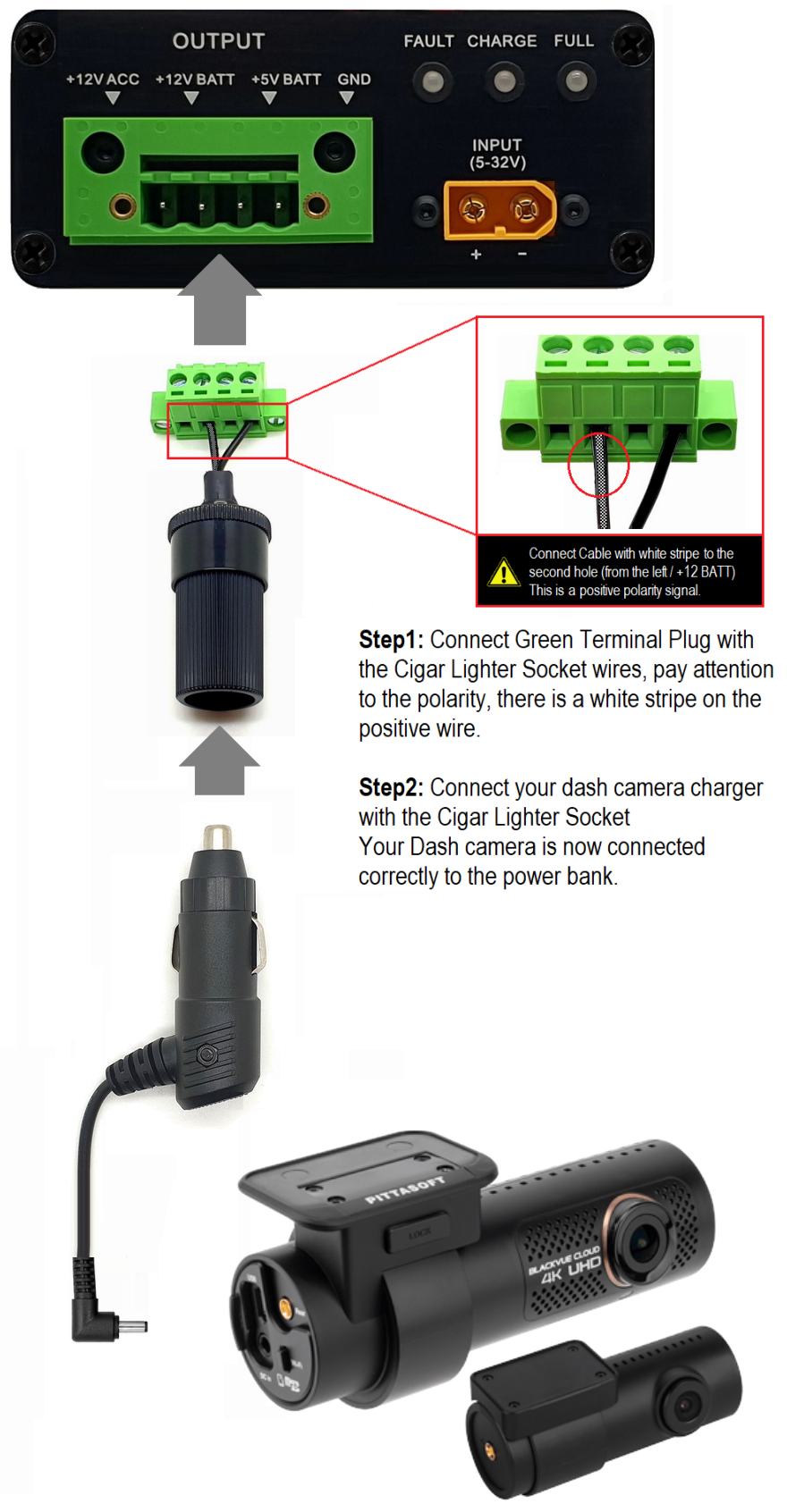 There are 3 available methods to connect Blackvue dash camera to the power bank Please choose which way of connection you preferred: |
