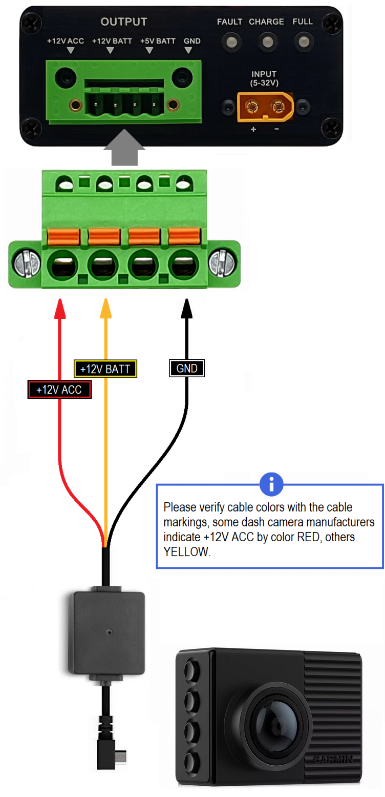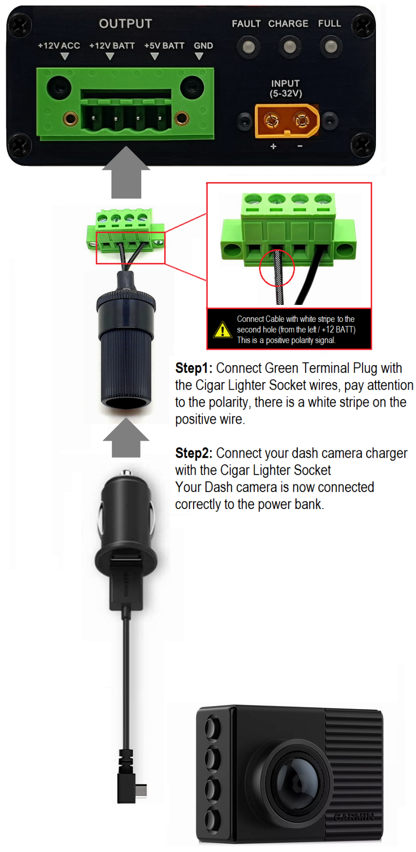 There are 2 available methods to connect Garmin dash camera to the power bank Please choose which way of connection you preferred: |
