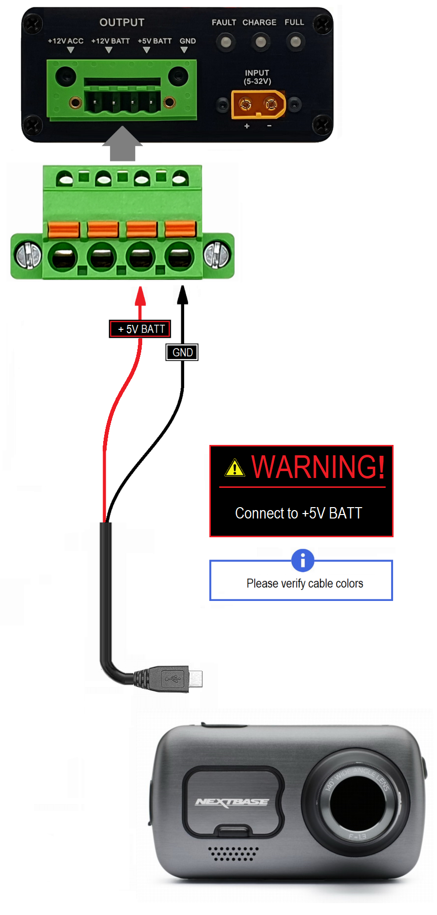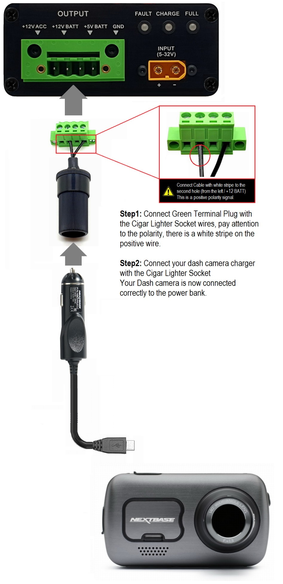 There are 3 available methods to connect NextBase dash camera to the power bank Please choose which way of connection you preferred: |