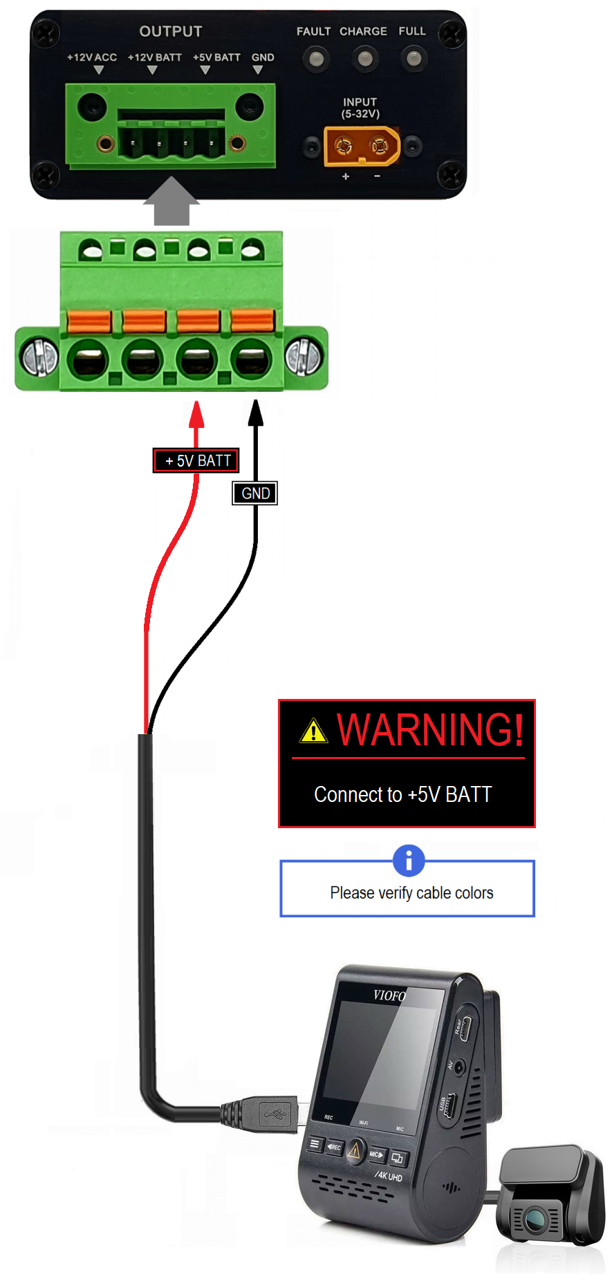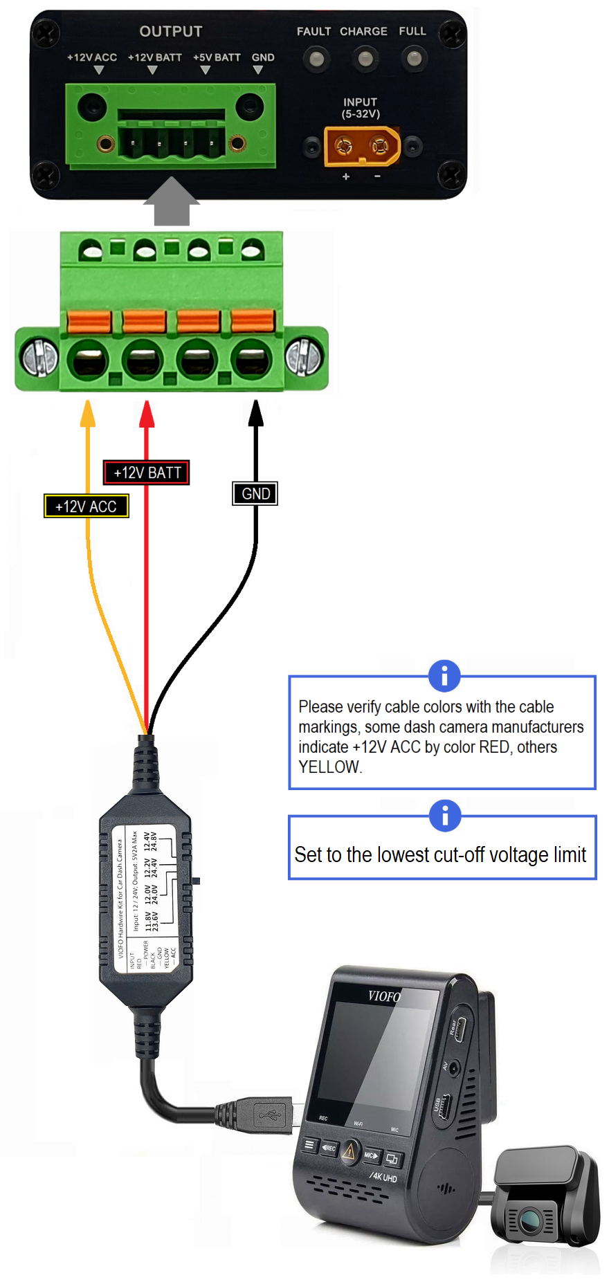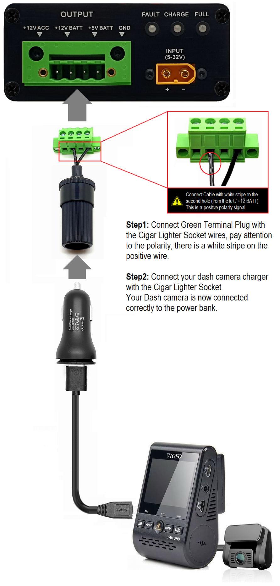 There are 3 available methods to connect Viofo dash camera to the power bank Please choose which way of connection you preferred: |