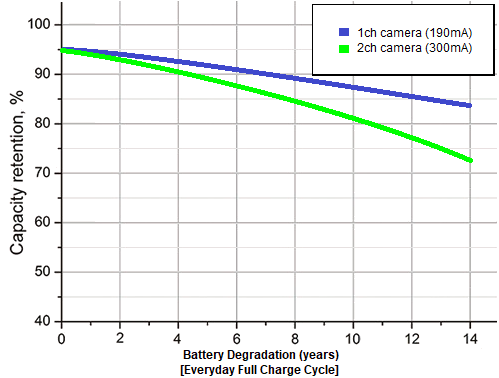 Power Bank rozpoczyna ladowanie w trybie ultraszybkim gdy silnik samochodu zostanie uruchomiony, bez zadnych praerw w zasilaniu kamery samochodowej. Zaledwie 60 minut czasu ładowania (jazdy) wystarczy, aby naładować power bank do 100% i utrzymać jednokanałową kamerę samochodową do 50 godzin w trybie parkowania gdy silnik samochodu zostanie wylaczony. Nawet krotkie doładowania, takie jak 15 minut- wystarczą, aby utrzymać jednokanałową kamerę samochodową przez 10 godzin (podwójna kamera 6 godzin). Przypadkowe krótkie doladowywania nie wpłyna na żywotność power banku a dzięki wewnętrznemu układowi kontrolujacemu i wydajnej konwersji mocy zapewniona jest jego długa żywotność. Ogniwa LiFePO4 gwarantują ponad 13 lat codziennego użytkowana zapewniajac wiecej niż 20% utraty pojemności nawet po osiagnieciu 5000 cykli pelnego ładowania-wyladowywania (13 lat to 4745dni).